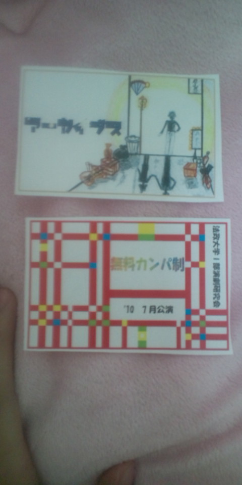 × [PR]上記の広告は3ヶ月以上新規記事投稿のないブログに表示されています。新しい記事を書く事で広告が消えます。 初めましてこんばんは(^o^) 1年宣伝美術の齊藤と申します!小学校の時のあだなはビッグジャンボでした( ´∀`) よろしくお願いします! 今回私はチケットを担当させていただいたのですが、29日に入稿を完了しました!! お客様にポイされないよう自分なりに持てる力とイメージを注ぎ込んで作ったので、気に入っていただければ幸いです(*^_^*) これから完成に向けてますますヒートアップする一劇! 気温もヒートアップ! 期末で脳内もヒートアップ! てな感じでしょうがみなさまくれぐれもオーバーヒートにはお気をつけて(≧ω≦)b 写真はチケットです 上が表、下が裏です。 裏は1枚看を参考にさせていただいてます。 それでは!!! PR はじめまして(・∀・)! 1年衣装メイクの高橋です^ω^ 公演まであと1週間ちょっとになりましたね´∀` それに合わせて明日は衣メ合わせがあります★ 役者さんに本番の衣装を着てもらうんですが、先輩方が作った衣装が素敵過ぎてすごい楽しみです\(^O^)/わ-い! 今からにやにやしてます(^q^) たかはし担当の衣装もなんとか今日中に終わらすことができそうです(`・ω・´)★ 役者さんに着てもらうっていうのはどきどきしますね! どきどきしすぎて冷や汗たらたらです! 衣装作りラストスパート(`・ω・´)! 少しでも冷や汗が止まる出来になるようがんばりますっ 他のセクションももちろん、役者さんたちの演技もめっちゃすごいんで全てが1つになった瞬間が今から楽しみです(^ω^) ということでみなさま! 是非見にきて感動しちゃって下さい\(^O^)/! 最後にベルト制作に使ったものたちの写メをぺたりしてさらばっ(`・ω・´)